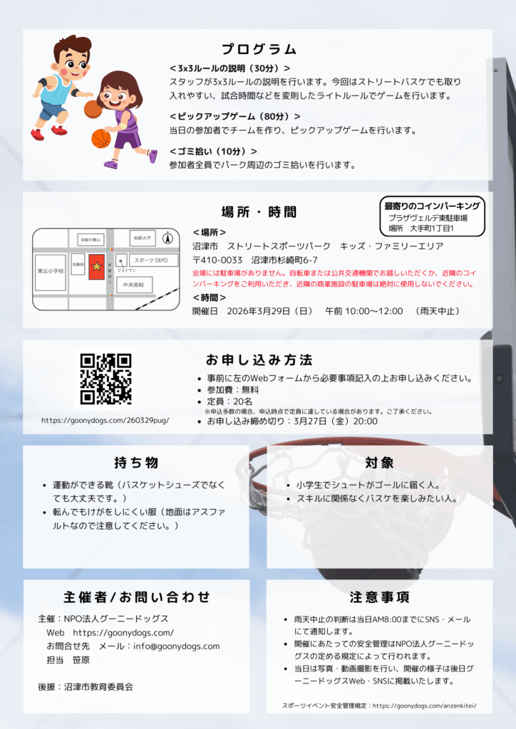 この度グーニードッグスでは、バスケットボールイベント「3x3ルールで始める!ピックアップゲーム体験会」を開催いたします。